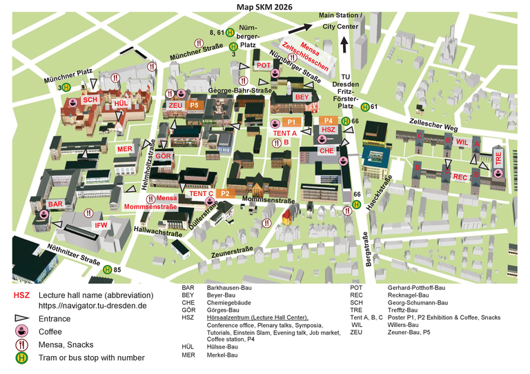 The conference will take place on the campus Südvorstadt. The central activities like registration, plenary talks etc. will take place in the Lecture Hall Center (HSZ) of the Dresden University of Technology (Bergstraße 64).